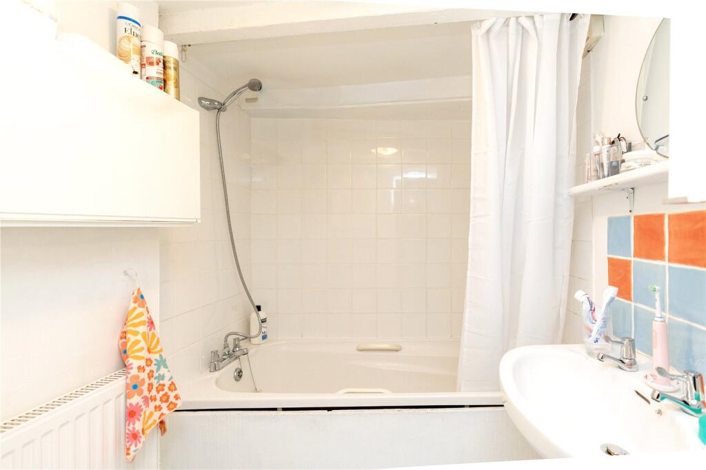 Wash hand basin, w/c, vanity cupboard. Bath with shower over and shower curtain, part-tiled, radiator. Extractor fan.