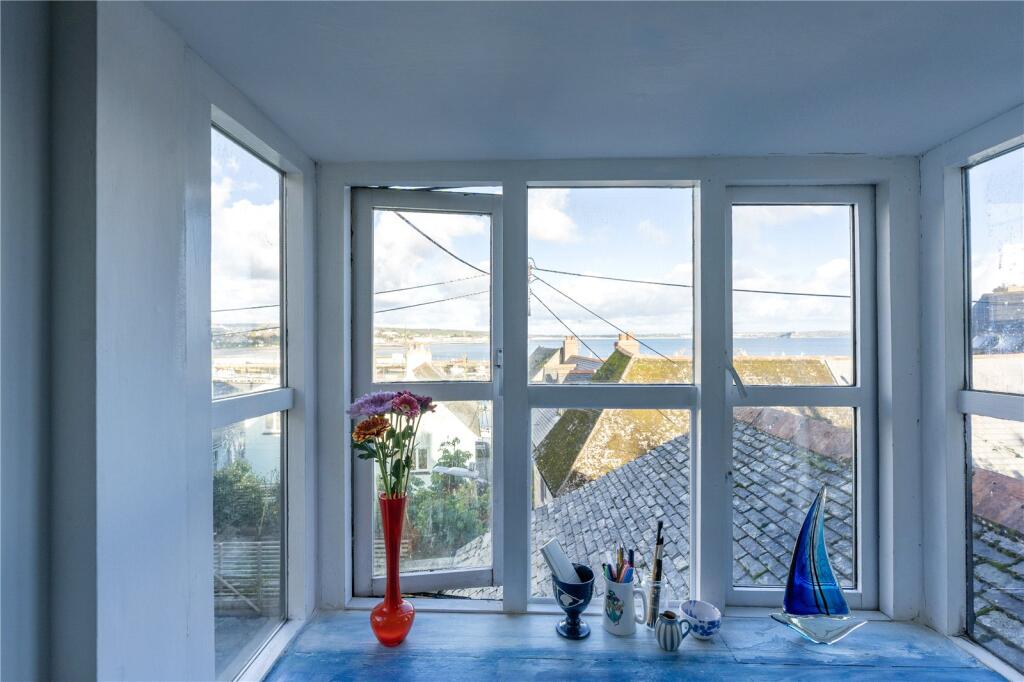 Single-glazed window to side with deep sill. Radiator, power points. Single-glazed sash window to front with view of Newlyn harbour and across to Penzance.