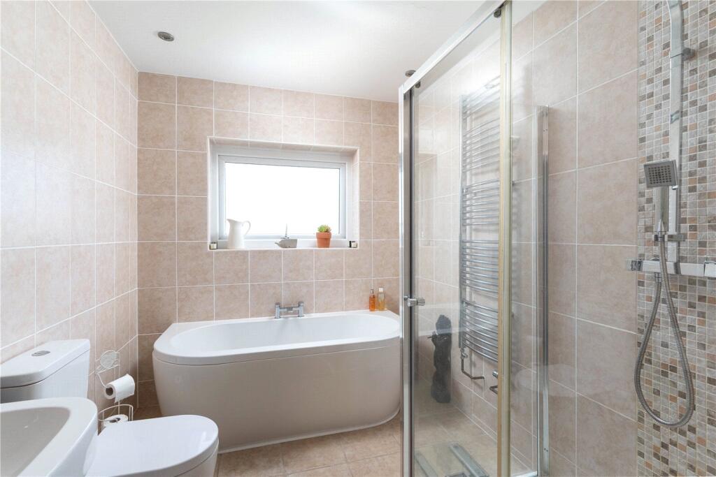 Frosted double- glazed window to side, tall heated towel rail, large shower, bath with mixer tap, w/c, basin.