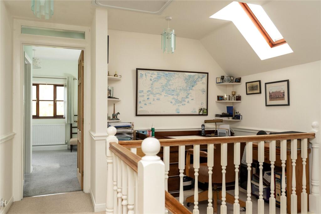 Access to loft on landing with loft ladder. Radiator. Office recess with Velux window and power points. Door to airing cupboard housing water tank, hanging space and shelving.