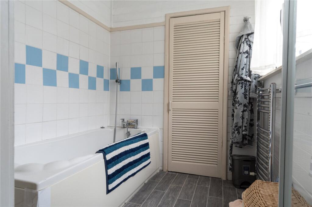 Double glazed window to rear, heated towel rail, bath with separate shower, door to large cupboard with boiler and hanging space.