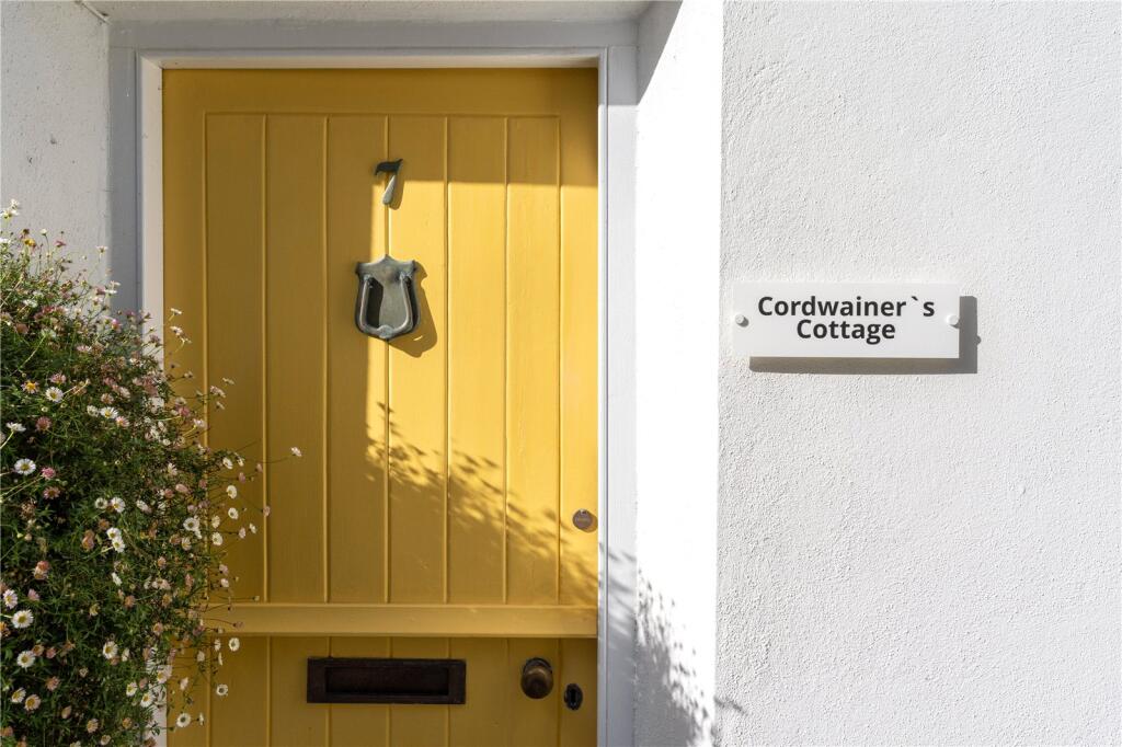 Stable door into the entrance porch, pretty glass window to the side and pattern tiled floor. Door into-