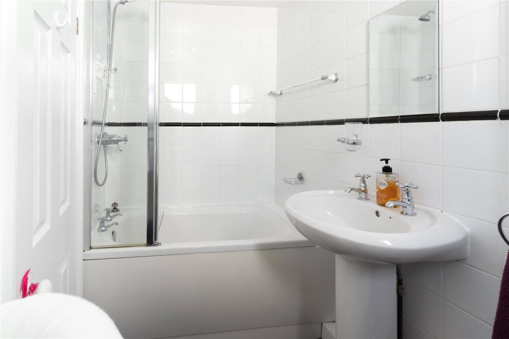Dual aspect double glazed frosted window to the side and rear. Tiled floor, access to roof space, heated towel rail, radiator, fully tiled, bath, shower over and screen, sink, WC