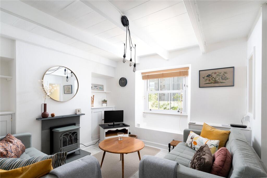 Double glazed sash sliding window to the front with seat recess below. Beams, slate fire surround with flue inset. Alcoves to either side with shelving and cupboards under., radiator. Door to understairs storage cupboard, second radiator, shelving to one corner and double glazed sliding sash window to rear. Power point, T.V port, B.T port and Hive. Door to-