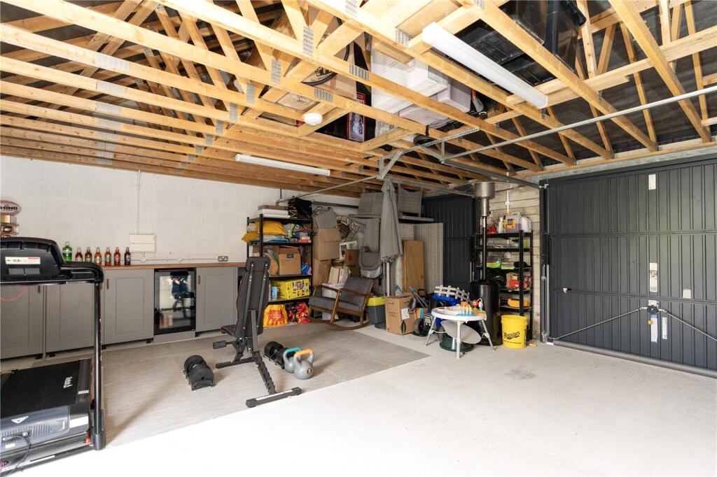 Pitched roof with overhead storage. Up and over door. Power points. Worktop surface ove with cupboards and drink chiller.