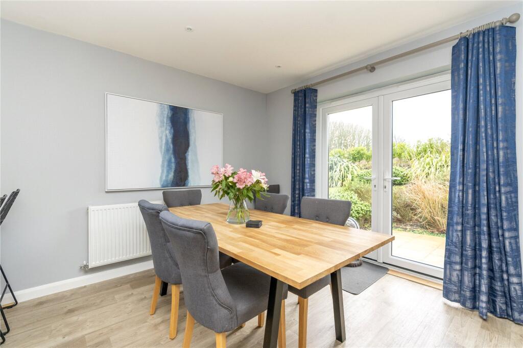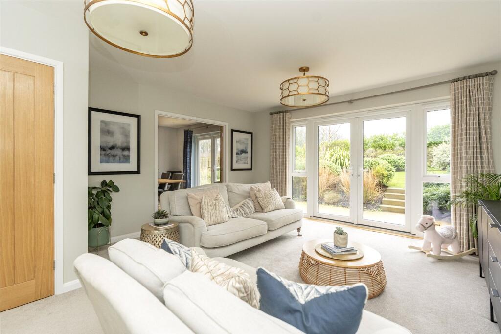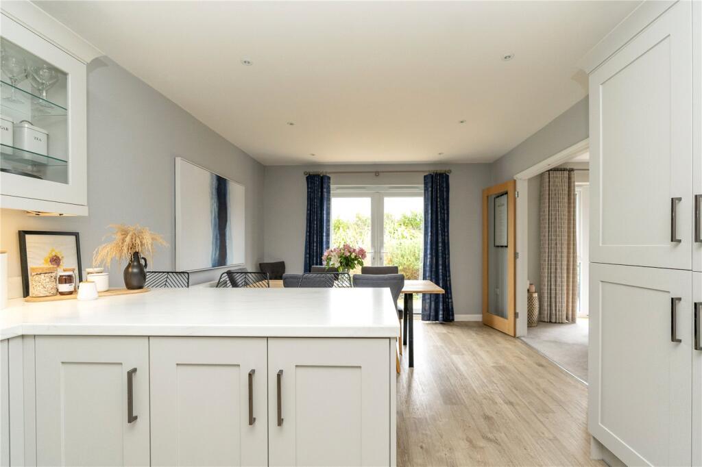 Double-glazed window to side. Fitted kitchen comprising extensive range of eye and base level cupboards, sink and drainer with mixer tap. Integrated 5 ring gas hob with extractor over, integrated electric oven, and grill, dishwasher, and fridge freezer. Power points. Breakfast seating for 3. Radiators. TV point. Double-glazed French doors with access to rear patio and garden. Glazed French doors into: