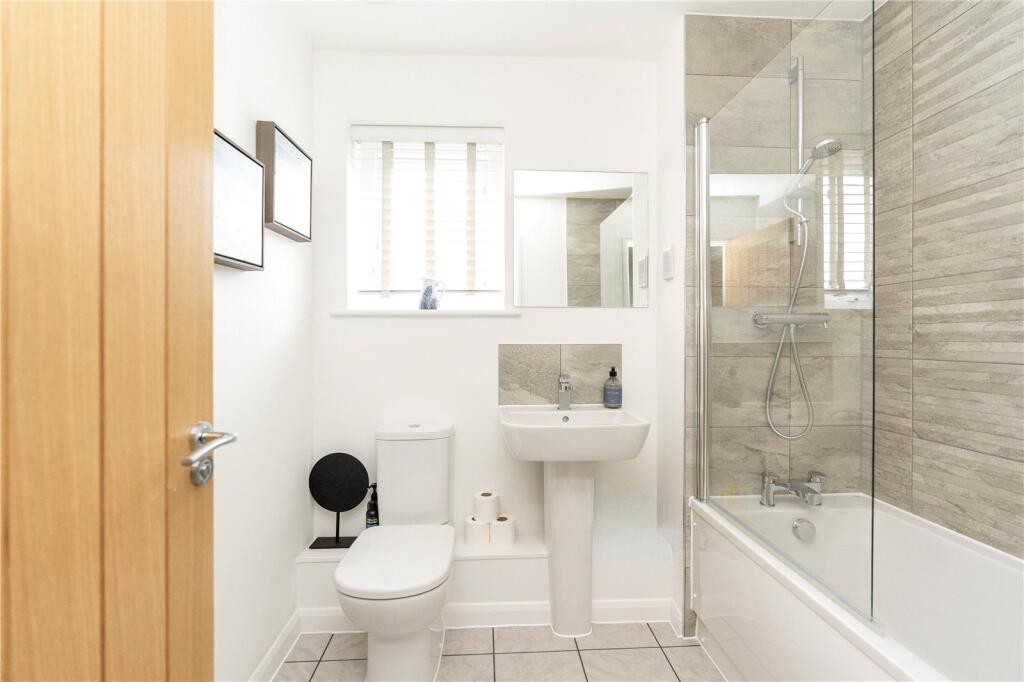 Double-glazed frosted window to front, heated towel rail, extractor fan, wall to wall shower, tiled splashback, wash hand basin, w/c, electric shaver point.