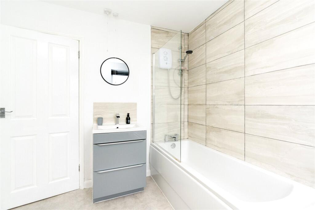 Double-glazed window to rear with deep sill under, double door to large airing cupboard housing water tank, and storage. Double doors to overhead storage, bath with mixer tap, shower over and screen. Wash basin with vanity unit under. W/C, tall heated towel rail.