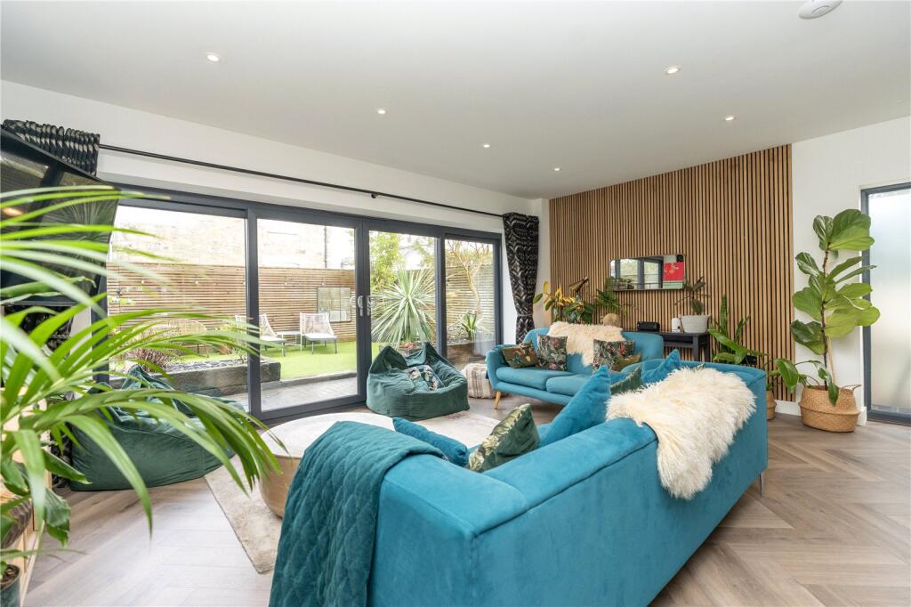 Fitted units with base and eye level units with worktops over. Seating with 4 stools. Wooden flooring throughout. Integrated fridge/freezer. AEG integrated microwave, AEG built-in oven. Lamona induction hob with extractor over. Sink with drainer and hot tap. Lamona built-in dishwasher. Power points. Double-glazed window to front with windowsill. Dining - double-glazed window to side, power points. Living - wooden panelling to two sides. power points. Double-glazed glass panel to side. Large French double-glazed doors opening onto rear. Door to understairs storage cupboard, power point.