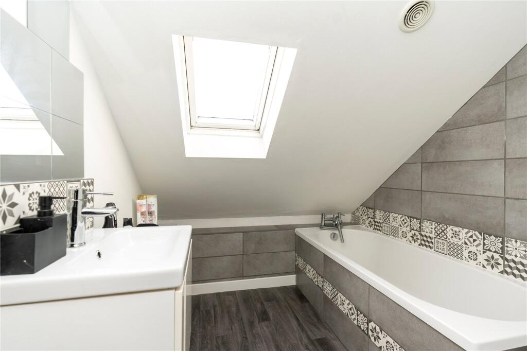 Velux window. Bath with hand-held attachment. W.C. Part tiled. Wash hand basin with vanity unit. Vinyl floor. Extractor fan.