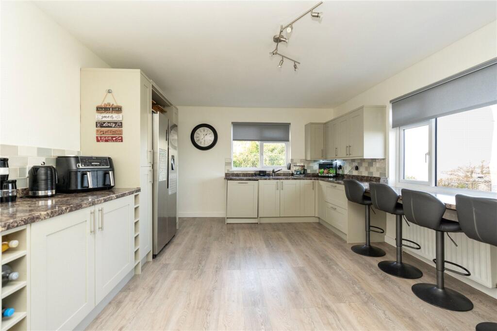Fitted base and eye level units with worktops over. Breakfast bar seating for 5. Space for American fridge freezer. Part-tiled. Power points. Integrated dishwasher, drainer with mixer tap. Radiator. Double-glazed window to side. Oven with extractor over. Double-glazed window to rear.