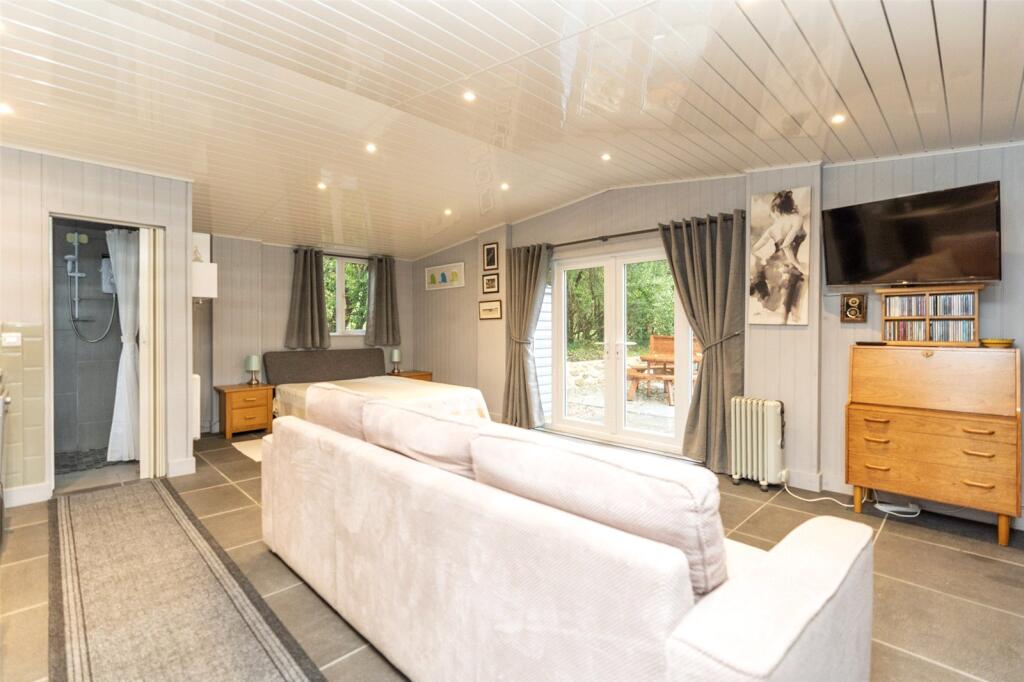 6.73m x - Roller door. Power. Open plan kitchen/living Kitchen - fitted base and eye level units with worktops over. Space for washing machine, Electric cooker with splashback, and extractor over. Sink with mixer tap and drainer. Part-tiled. Space for freestanding fridge/freezer, space for slimline dishwasher Double-glazed frosted window to side. Power points. French doors onto garden area. Double-glazed window to side.