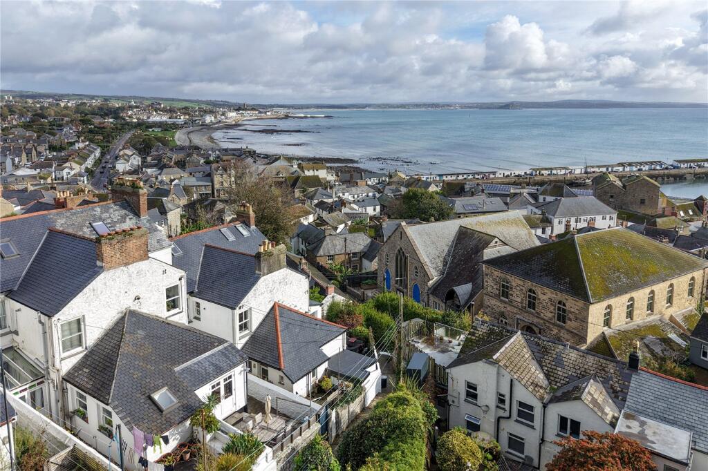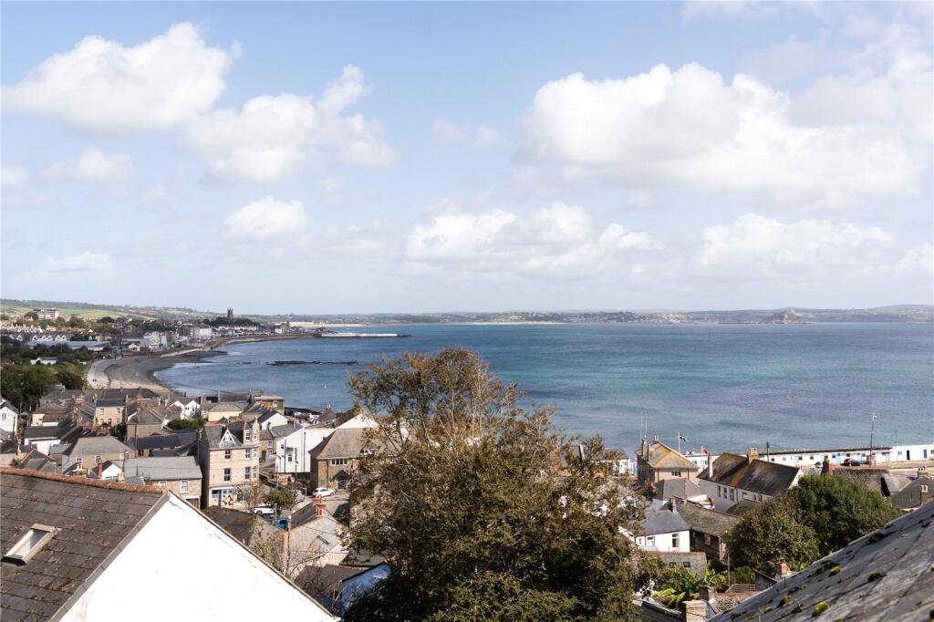 Dual aspect window to front and back, bay window to front with sea view and view of the Mount. 2 Radiators, double-glazed sash window to rear with attractive outlook. Woodburning stove on slate hearth, wooden flooring, alcoves, cornicing, period fireplace, power points.