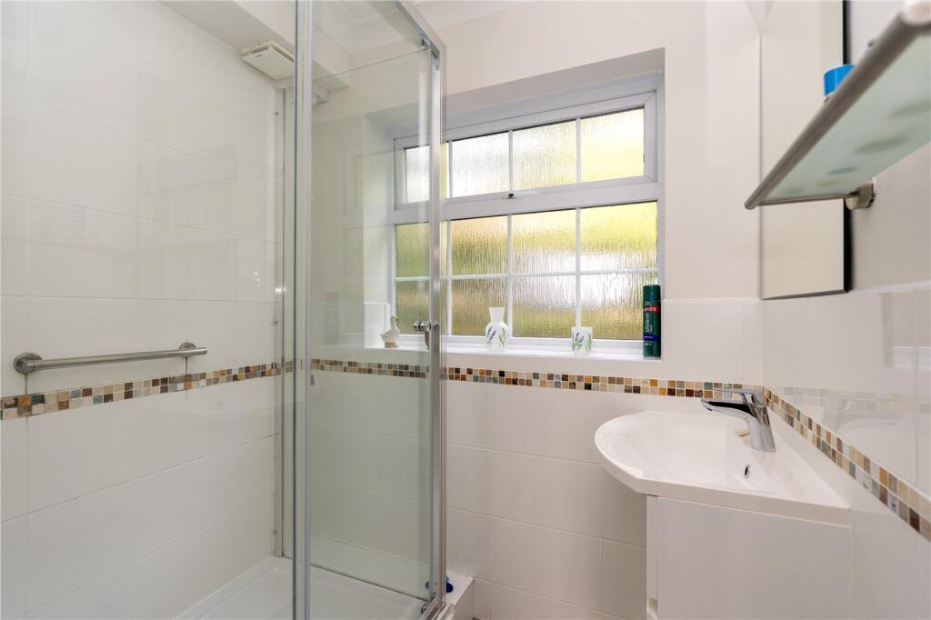 Door to storage cupboard shelving. Tall heated towel rail, floro to dado tiling, extractor fan, double shower, w/c, wash hand basin with vanity unit under.