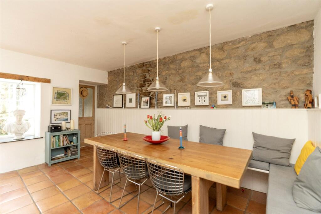 Vertical radiator, power points. space for table and bench seating for 6. Tiled floor. Single-glazed window to rear with deep sill.