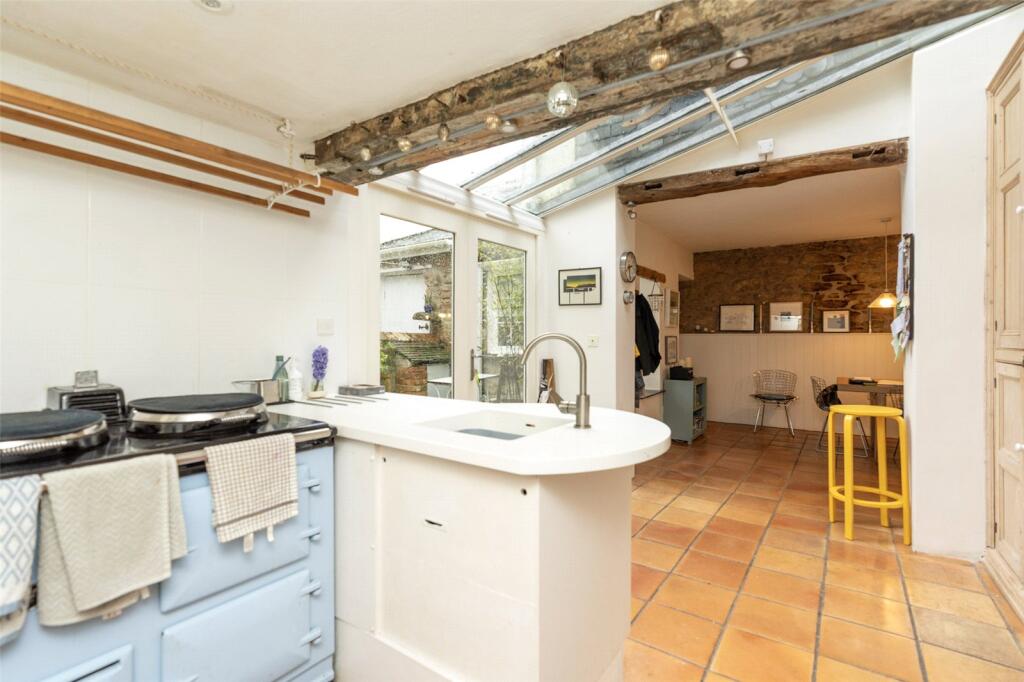 Fitted base and eye level units with curved worktops. Sink with drainer and mixer tap. Integrated bottle rack. Tiled floor. Integrated dishwasher, space for fridge/freezer. Blue Aga, Worcester Bosch boiler. Exposed beam. Part-tiled. 4 Deep cupboards with additional storage and shelving. Glass roof, wooden glazed door into:
