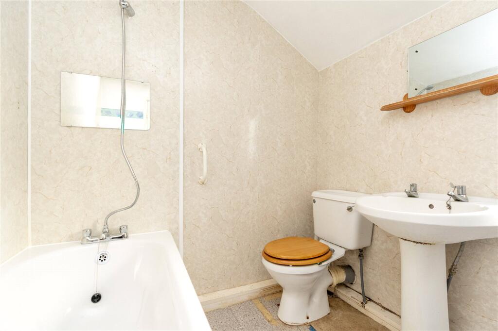 Mirror. Double-glazed frosted window to side, bath with shower over, w.c., wash hand basin, radiator.