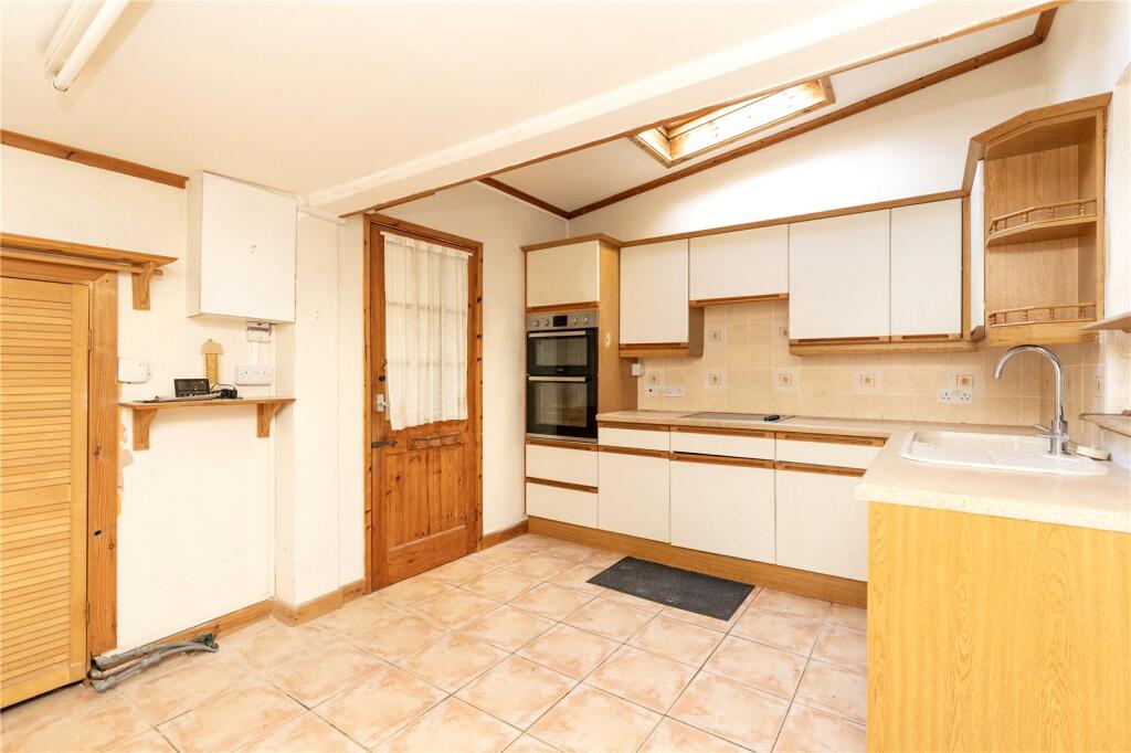 Tiled floor. Frosted glass through to lounge. Cupboard housing consumer unit. Fitted base and eye level units with electric hob, sink with drainer, 2 Velux windows, space for fridge freezer. Zanussi built-in oven and grill. Radiator, power points. 2 Door storage cupboard. Small area for dining table. 1/2 Single-glazed door to:
